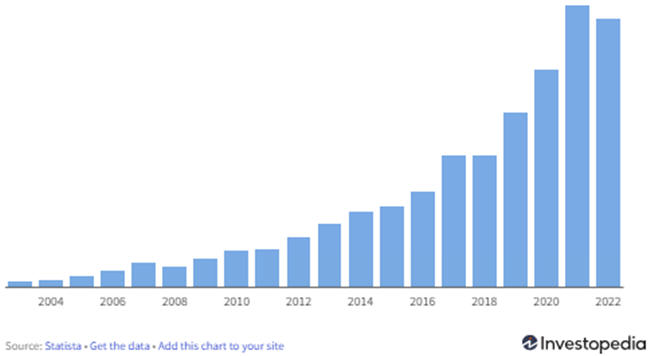 Im Jahr 2003 wurden 60 Mrd. USD in ETF investiert. Im Jahr 2022 waren es bereits 10.000 Mrd. USD.