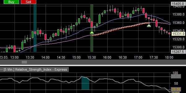 This example shows a buy signal. The bullish cross (first requirement) is highlighted in blue. Afterwards the RSI reached the 80 level (second requirement). From that moment the background of the RSI changes its colour to blue. After the first pullback to the fast EMA (third requirement) a buy signal was triggered. The signal is indicated by the green background.